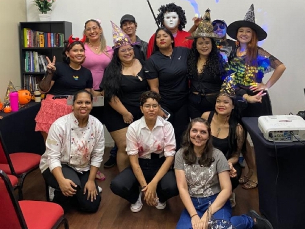A turma de inglês do hotel Hollyday inn comemorando o halloween nesta data dia 03 novembro de 2023. Momento de entretenimento e diversão. SINDECHRSAM, SENAC e HOTEL HOLLYDAY INN, uma parceria promovendo a educação e cultura.
