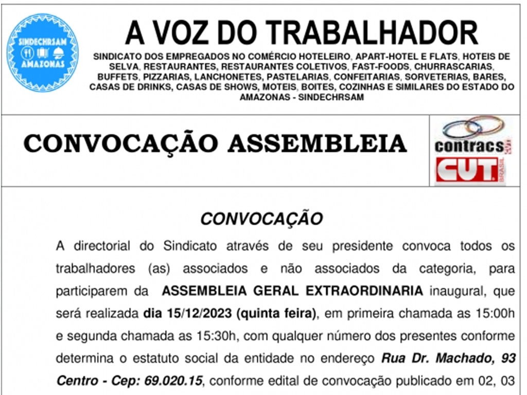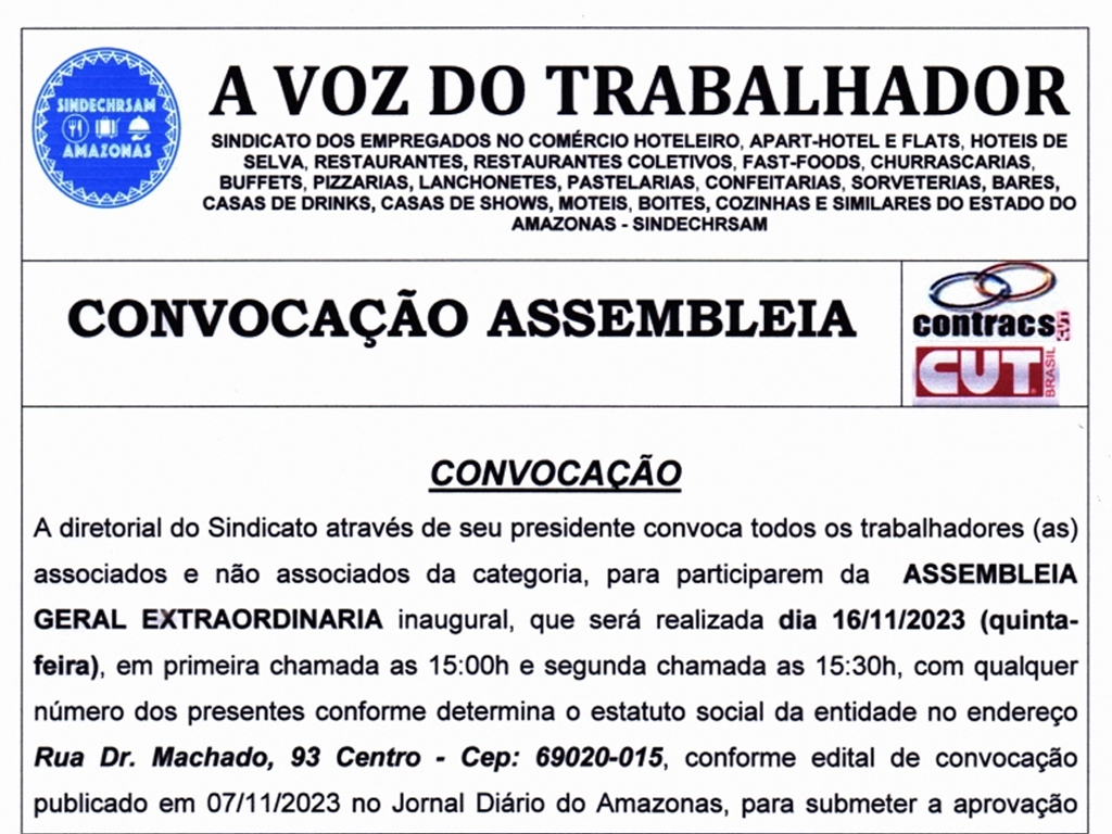 A diretorial do Sindicato através de seu presidente convoca todos os trabalhadores (as) associados e não associados da categoria, para participarem da ASSEMBLEIA GERAL EXTRAORDINARIA inaugural, que será realizada dia 16/11/2023 (quinta-feira), em primeira chamada as 15:00h e segunda chamada as 15:30h.