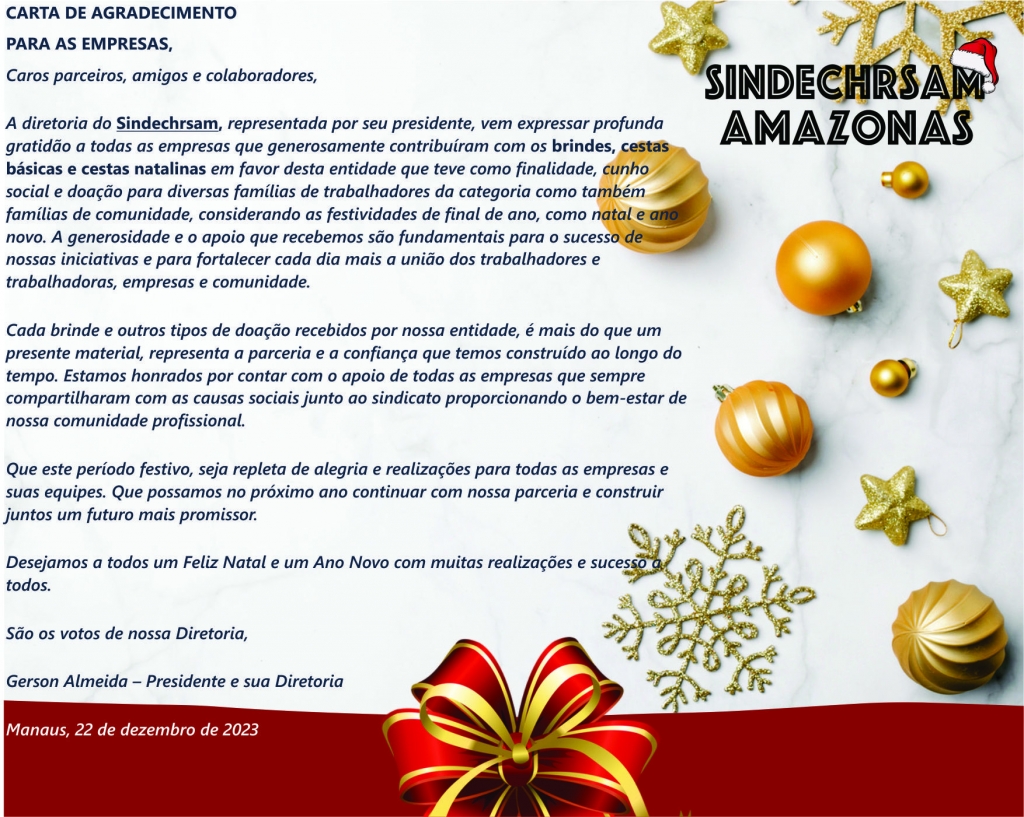 A diretoria do SINDECHRSAM participou do encerramento do curso básico de inglês no hotel Holiday Inn, nesta data, 12 de dezembro de 2023. Essa conquista é resultado da parceria entre o sindicato da categoria e o SENAC do Amazonas, sob a coordenação da professora Laís e sua equipe, contando também com o apoio da empresa Holiday Inn.