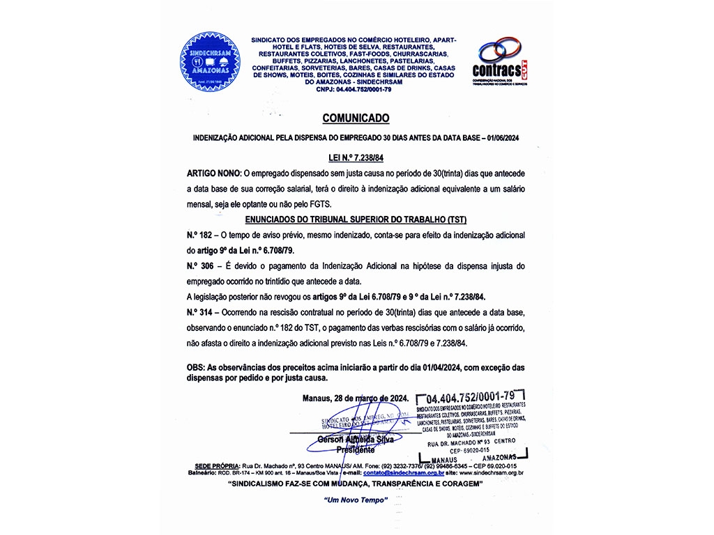 A diretoria do SINDECHRSAM em assembleia com os trabalhadores e trabalhadoras do hotel ibis Djalma Batista, hotel da rede Accor, nesta data dia 29 de abril de 2024, para renovação do acordo de banco de horas com diversos benefícios, como também falar da convenção coletiva de trabalho e seus benefícios e da importância do sindicato na representação dos trabalhadores. A luta é nossa, a vitória é de todos. Contracs/cut. Gerson Almeida-presidente