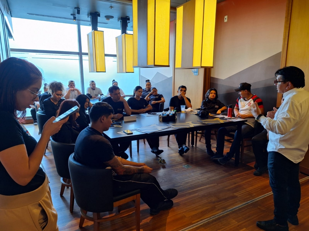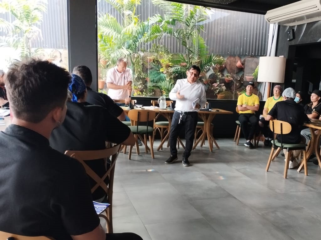 A diretoria do SINDECHRSAM em assembleia de base com os trabalhadores do restaurante Pobre Juan para aprovação do acordo da cobrança da taxa de serviço e os critérios da distribuição com os trabalhadores, banco de horas e aprovação da pauta de negociação da categoria com data-base primeiro de junho nesta data, dia 25 de abril de 2024. É o sindicato da categoria em ação. "A luta é nossa, a vitória é de todos" Gerson Almeida - presidente