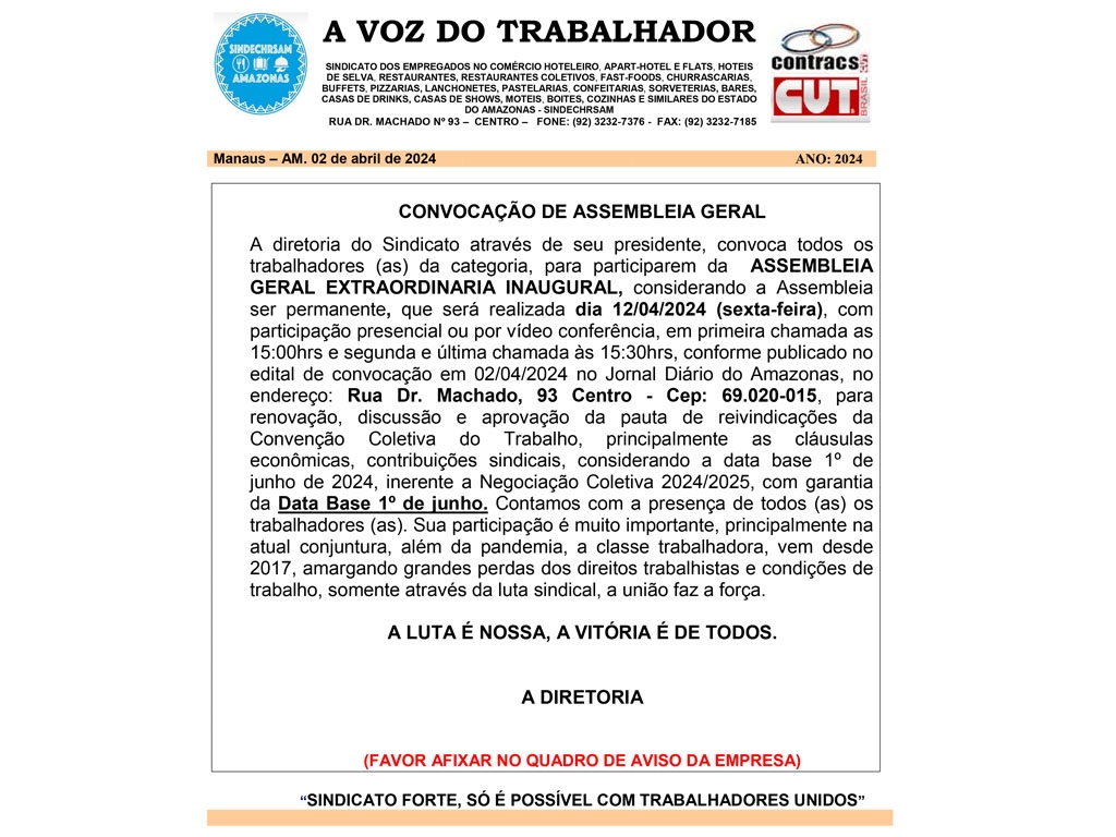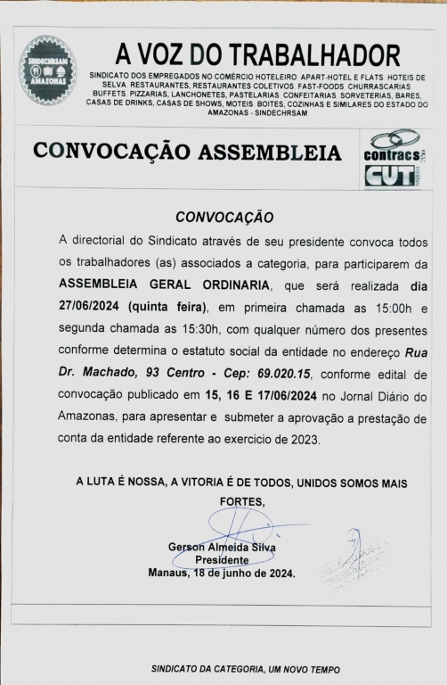 CONVOCAÇÃO DA ASSEMBLEIA PARA TODOS TRABALHADORES ASSOCIADOS A CATEGORIA, QUE OCORRERÁ NO DIA 27/06/2024 AS 15:30.