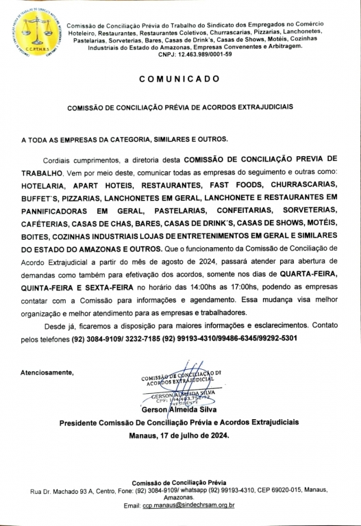 COMUNICADO DA COMISSÃO DE CONCILIAÇÃO