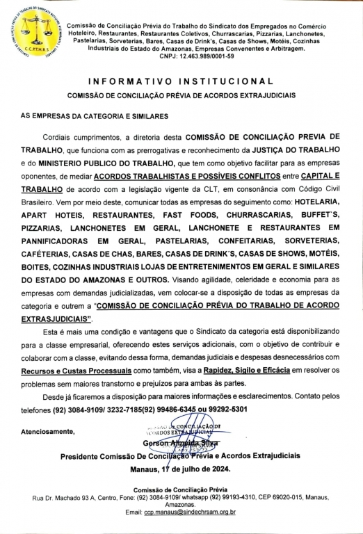 Este informativo é para conhecimento das empresas com relação a demissão através de acordo na comissão de conciliação prévia e arbitragem para realização de acordo extra judicial. É mais uma alternativa dada pelo Sindechrsam.